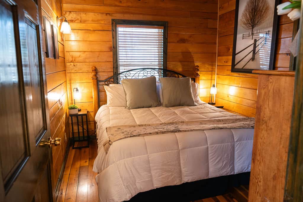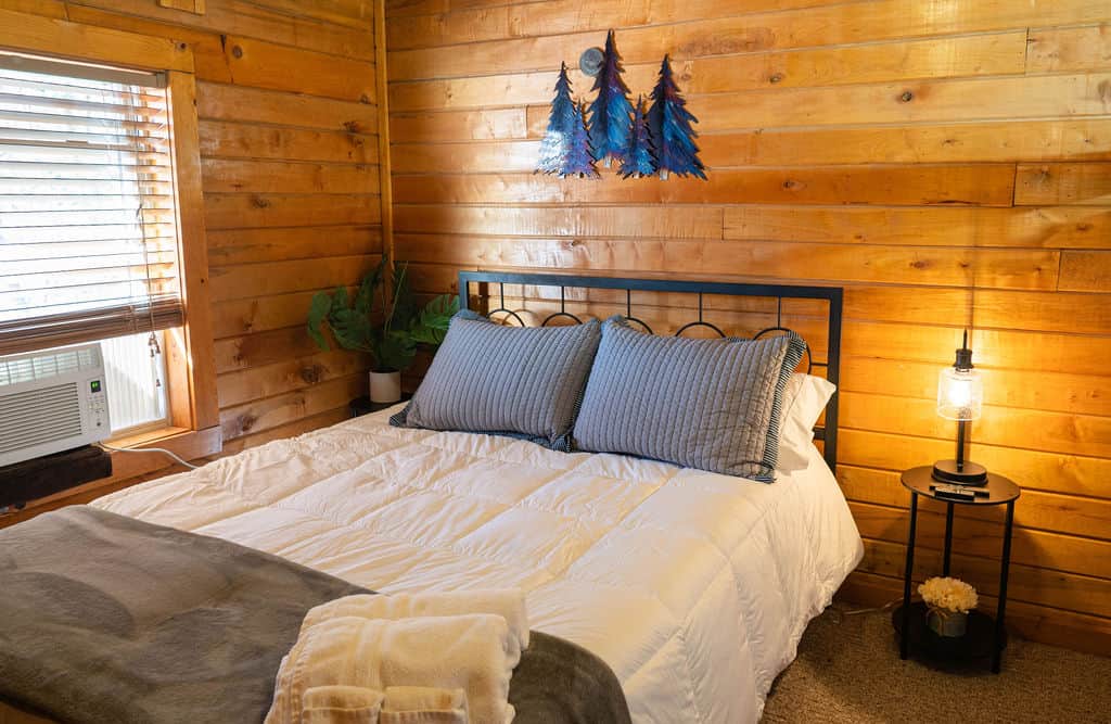 The cabin comfortably sleeps up to 6 guests with two private bedroom suites and 2.5 bathrooms. The main-level king suite includes a private ensuite bath and a jetted tub. The second suite includes a queen bed, twin bunk beds, and its own ensuite bathroom.